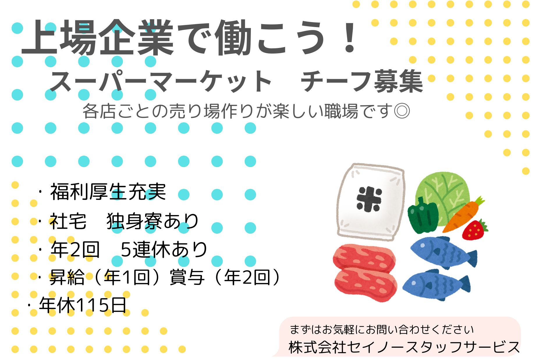 本社での正社員勤務 食品スーパーの店舗運営部での課長職 福利厚生充実
